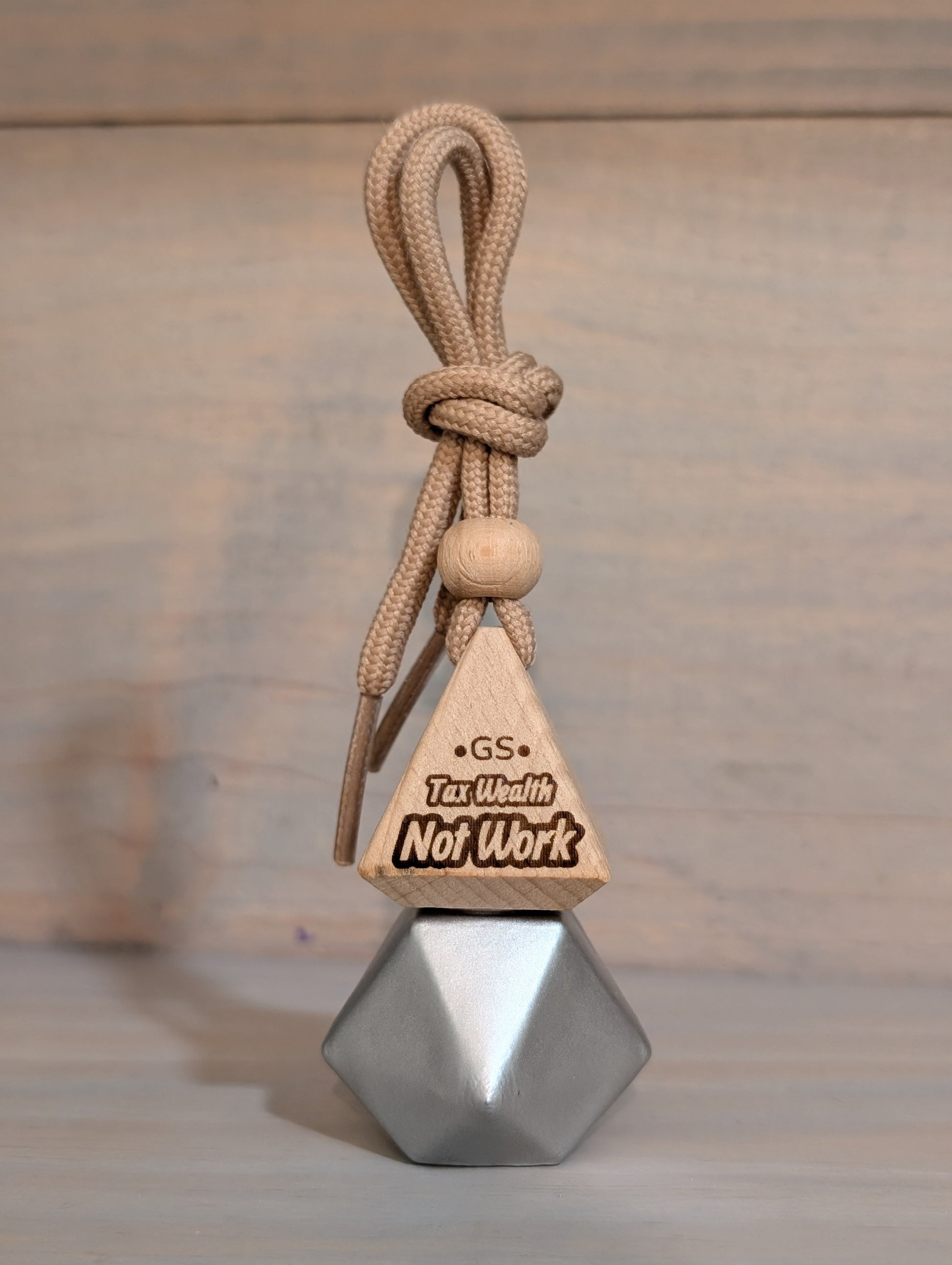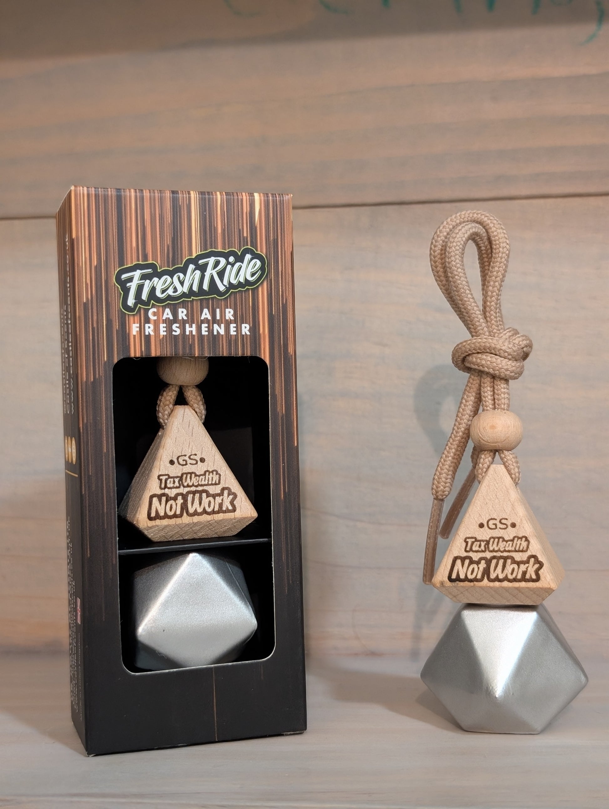 This is hand made, Tax wealth Not work car air freshener with a piece sign engraved on the wooden lid. It’s really nice looking and one of a kind piece as it’s made in house by us.